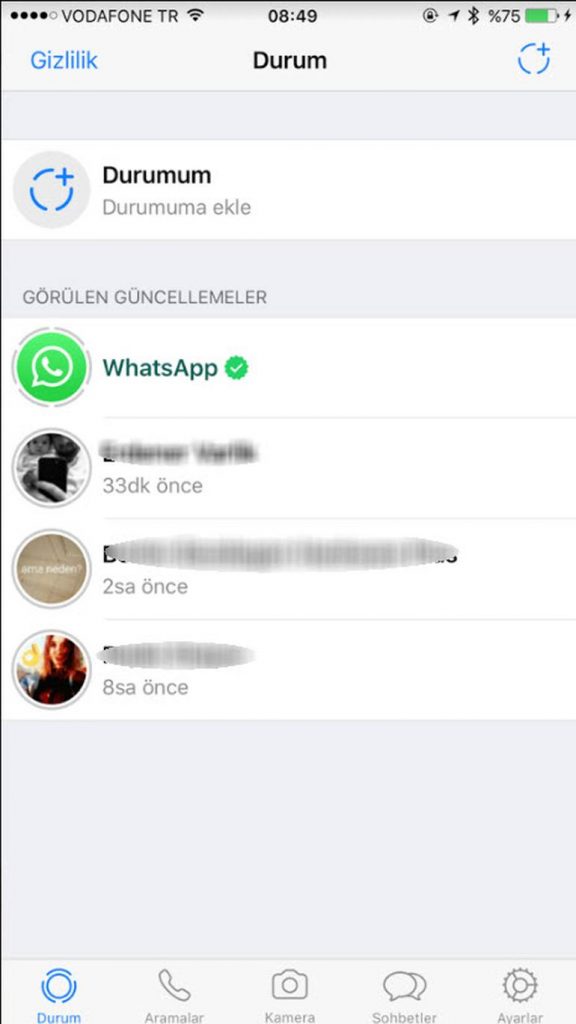 Eğer siz de kendi hikayenizi paylaşmak istiyorsanız izleyeceğiniz yöntem şu: Örneğin iPhone kullanıyorsanız önce Whatsapp’a girin; ardından ayarlar menüsüne ulaşın. Ayarlar menüsünün hemen solunda bulunan Sohbetler, Kamera kısımlarını da atlayın ve Durum yani Status kısmına girin. İşte Whatsapp’ın Hikayeler özelliği tam olarak da burada ayarlanıyor.